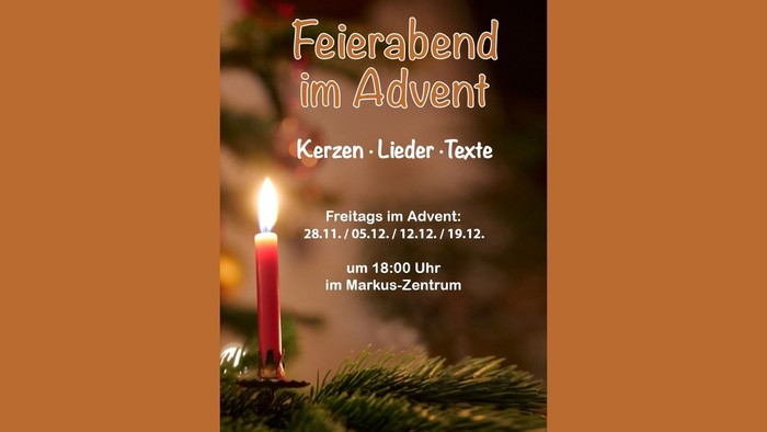 Endlich Feierabend - das wollen wir in einer kleinen Runde mit Musik, Gesang, Kerzen und Gedankenimpulsen feiern. Jeden Freitag im Advent um 18 Uhr im Markus-Zentrum.