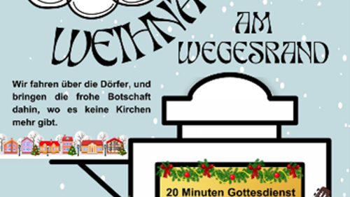 Am Heiligabend bringen wir die frohe Botschaft dorthin, wo es keine Kirchen mehr gibt! Kommt zu uns auf unserer Tour über die Dörfer: 20-Minuten-Gottesdiensten mit Weihnachtsliedern und kurzen Impulsen von Rainer Wülbeck und Thorsten Schröder.